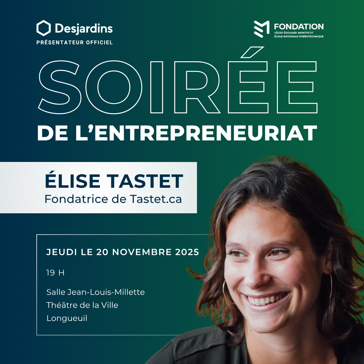 La 8e édition de la Soirée de l’entrepreneuriat, présentée par Desjardins, mettra à l’honneur l’entrepreneure chevronnée Élise Tastet, fondatrice du phénomène Web Tastet.ca. La soirée aura lieu le 20 novembre 2025 à la salle Jean-Louis-Millette du Théâtre de la Ville, à Longueuil.